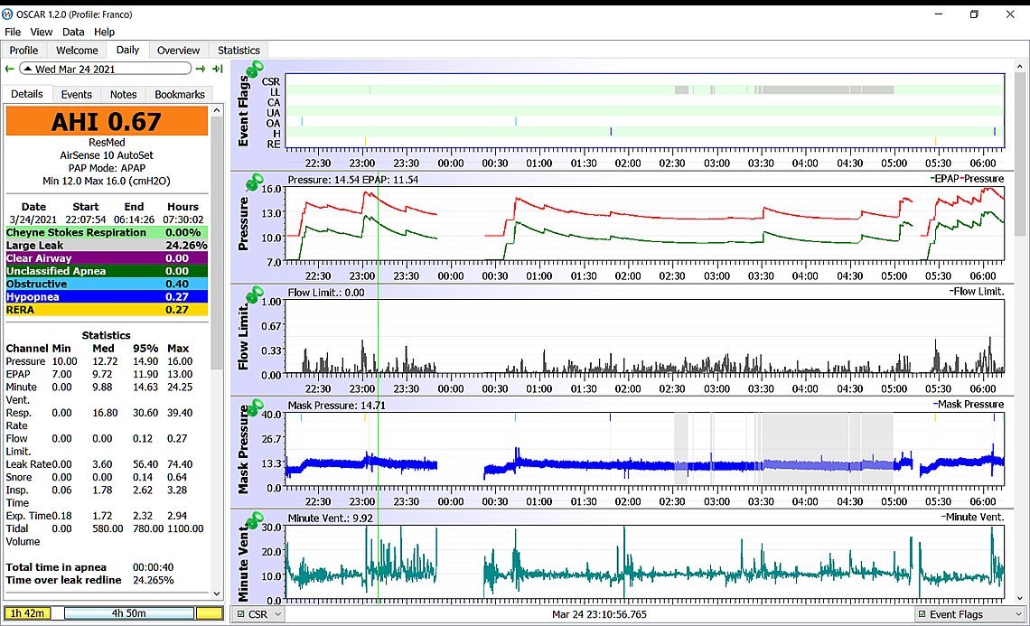 I have also checked the CSR issue. The Stats show an incidence of 0% over the last 30 days and 0.11% over the last 6 months. I don’t think I should worry. From what I begin to understand, there may be some interesting clues in the Flow rate, the Flow limit and the Minute Ventilation graphics, but all this is kind of nebulous for me at this stage, because the analysis of these parameters involves a good understanding of technical and physiological issues. It is really a fascinating issue, even more so that it is about my health and I hold dearly to it.