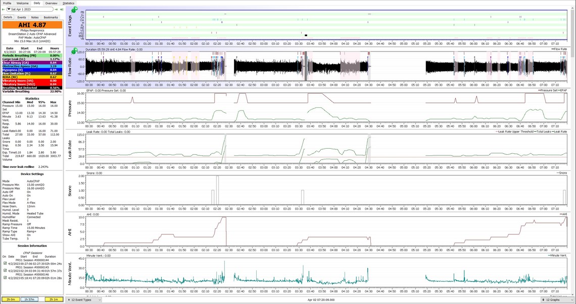 I had my appointment with the sleep tech at Kaiser last Tuesday, April 11th. The plan, in my mind, was to get evaluated for a BiPAP. I talked about what I was doing with OSCAR and my Phillips machine. The tech knew nothing about OSCAR and of course did not trust it out of ignorance. He assumed OSCAR was manipulating the data and I insisted it just showed the data in a graphical form. Also, I asked him if they even looked at the data for my Phillips at their end. They did not. He gave me a Resmed Airsense 10 as a loaner for a week and I have a follow-up appointment tomorrow. He asked me to not mess with the settings. I assured him I would not. I asked him what the settings were and he told me 5-20 cmH2O. I asked him to raise the lower to something like 10-13. I told him my current weight and he did raise it to 10 cmH20. I've been using the Resmed consistently. It has been surprisingly more comfortable than the Phillips. Unfortunately, the tech did not put in a SD card, so I was unable to upload the data. I do know that the settings are not getting me better sleep or rest and I am waking to often. Most nights, the numbers look good on the Resmed, including leaks, but I know how deceptive that report card can be. I'm concerned the tech will just go by those number and say I'm good to go.