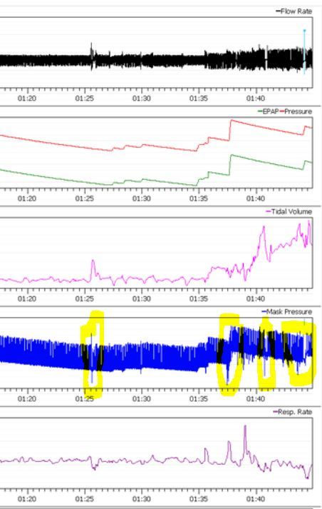 The event near the left of the top image at 1:37:30 would be interesting zoom in on. It appears to have multiple drops in pressure while the flow rate is reasonably normal. But the exhale (down) flow rate seems to have a lot of noise on it. One possibility is that the flow rate sensor is not measuring flow reliably and that in turn is affecting pressure.